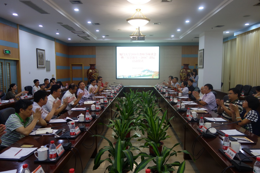 座谈会上,潘懋元、黄福才、林亚南、刘文、何丽新、朱水涌等教师代表畅所欲言,谈了对教师这一职业的理解,以及对教书育人的感想体会,大家同时就办好“大学新生·2016”讲坛提出了意见和建议。老师们表示,随着教师社会地位和生活待遇的不断提高,社会、家长和学生对教师的期望值也日益提升,在这样的背景下,教师更要坚定理想信念,自尊、自爱、自强,有创新、有追求,要弘扬良好的师德师风,讲奉献,讲担当,以乐观积极的态度和拼搏进取的精神站好三尺讲台。林丽容、林辉煌等学生代表谈了青年学生心目中的好老师,同学们表示,老师对青年学生的影响是潜移默化,润物细无声的,青年学生要懂得尊敬老师、感恩老师,知行合一、学以致用。