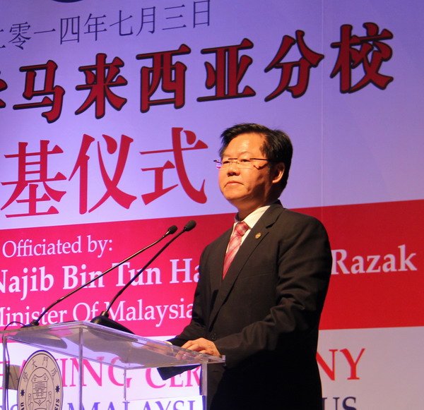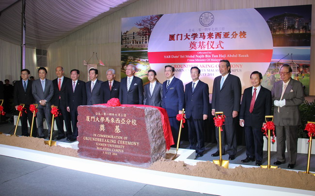 厦门大学马来西亚分校奠基典礼7月3日在马来西亚雪兰莪州雪邦市隆重举行,马来西亚总理纳吉布、中国教育部代表陈舜和厦门大学校长朱崇实等出席奠基仪式。