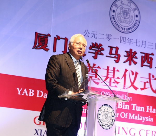 纳吉布在致辞中表示,厦门大学是中国著名大学,厦门大学马来西亚分校的建立,不仅将吸引国外高水平学生来马留学,也将会为本国学生提供在当地上世界名校的机会,有助于马来西亚高等教育水平的提高,为本国、乃至东盟地区培养更多综合性人才。马来西亚政府将会对厦大马来西亚分校的建设和运营给予全力支持。
