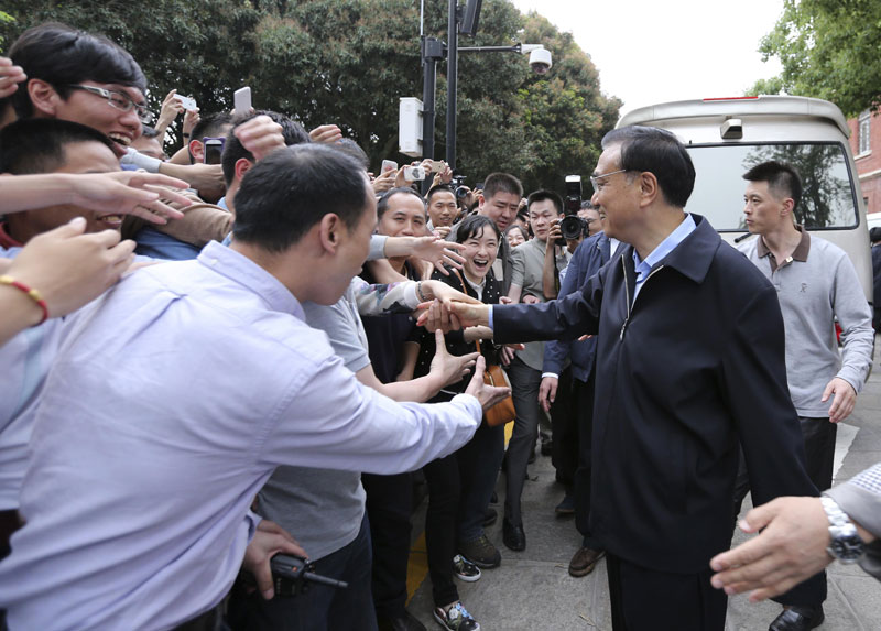 在一个多小时里,李总理先后来到校史馆、“厦大时光”书店和学生活动中心,了解我校办学历史、近年来的改革发展情况及学校的就业创业工作等,并与师生们亲切交谈。总理来校视察的消息如一股热浪瞬间传遍了整个校园,师生们欢欣鼓舞、倍感振奋。道路两侧、宿舍走廊,站满了闻讯前来的师生,大家纷纷打出“总理,您好!”“青年强、中国强、总理强”“强哥,我们爱您”“欢迎您常来”等标语向总理致意,“总理好”“总理赞一个”的呼声此起彼伏……总理面带笑容走向人群,与大家握手问候。