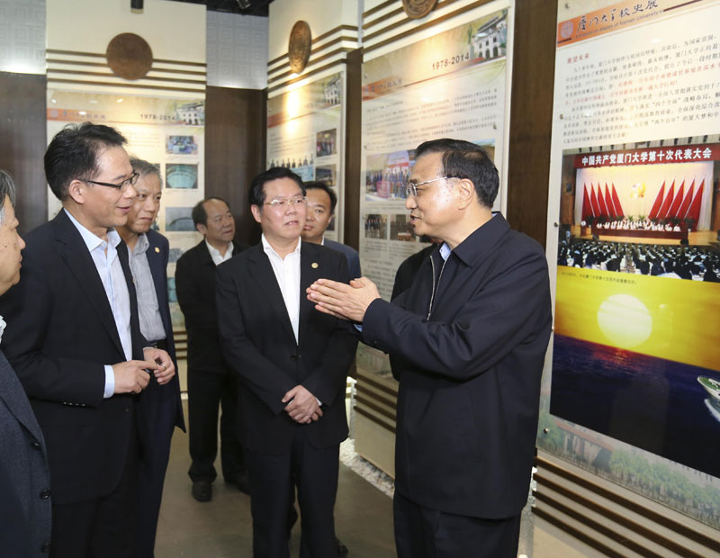 在与中科院院士、化学化工学院教授田中群,中科院院士、海洋与地球学院教授焦念志,台湾研究院院长刘国深教授,宏观经济研究中心主任李文溥教授的交谈中,总理亲切询问他们的学科建设和科研最新进展情况,并就煤化工、海洋碳汇、中国宏观经济等问题认真听取了几位专家的意见与建议。总理不时插话并交换意见。他高度评价几位教授所做的工作很有意义。他希望学校进一步发挥基础学科和应用学科的综合优势,深化综合改革,进一步提高自主创新能力,服务国家和区域发展,为实现中国梦发挥更大作用。