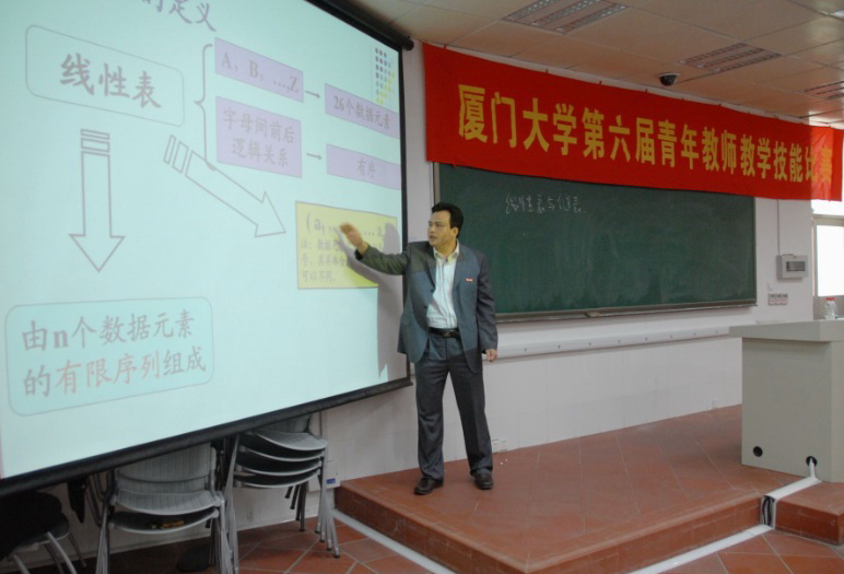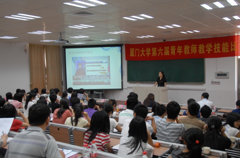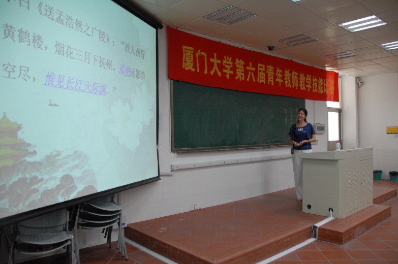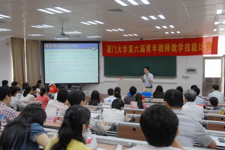 校工会和教务处、人事处联合举办的"厦门大学第六届青年教师教学技能比赛"决赛5月29日在集美二101教室举行,经过初赛选拔脱颖而出的12名选手在赛场上各施所长,各展风采。以郭祥群教授为组长、朱水涌、沈明山、洪永强、林志扬、陈培爱、林坤辉教授等7名教学经验丰富的专家名师担任决赛评委,组委会还聘请了相关学院的10名优秀学生代表担任评委。校工会常务副主席林永生、校工会副主席陈毅辉、人事处副处长邓净阳出席了决赛。决赛由校教务处副处长施芝元主持。经过一天紧张而激烈的角逐,来自人文学院的李菁和软件学院的吴清锋获得厦门大学第六届青年教师教学技能比赛特等奖。