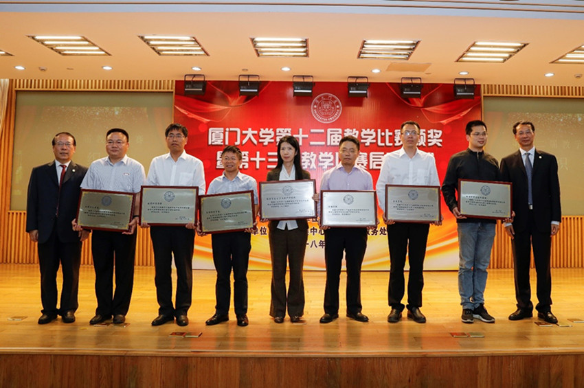 教务处处长、比赛工作委员会副主任计国君宣读厦门大学第十二届教学比赛获奖通知。与会领导、评审专家先后上台为第十二届教学比赛组织奖,教学比赛最佳教案奖和最佳课件奖,教学比赛二等奖、一等奖、特别奖、特等奖的获奖单位和个人颁奖。