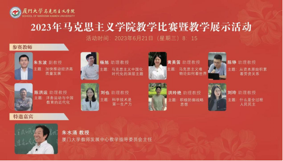 2023年6月21日上午,马克思主义学院2023年教师教学比赛暨教学展示活动在囊萤楼302会议室举行。比赛特别邀请厦门大学教师发展中心教学指导委员会主任朱水涌教授进行指导点评。思政课教改研究中心负责人、各教研部主任出席。马克思主义学院副院长原宗丽主持比赛。