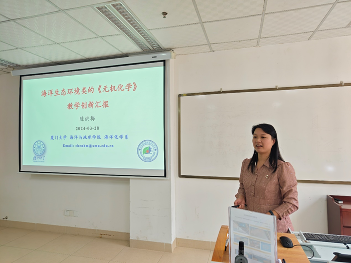 陈洪梅以“海洋生态环境类《无机化学》课程教学创新”为主题作了报告,以高考改革后新生在化学课程的学情入手,针对性地提出《无机化学》教学中如何开展分层次教学,引入国内外优秀教学素材资源激发学生兴趣,同时开展基于海洋、环境专业应用领域的教学研讨,重视课后学生回馈进行课程共创。