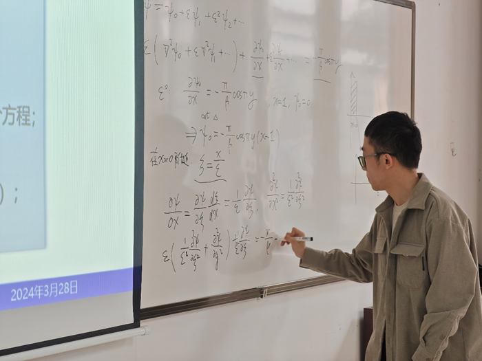 杨洋主讲的课程为《数学物理方程及其应用》,以“奇异摄动法在西边界流问题中的应用”讲述数学物理方法在海洋水文动力研究中的具体应用,他以清晰的公式、生动的板书推导和引导性的提问让学生快速地理解和掌握方程推导及应用。