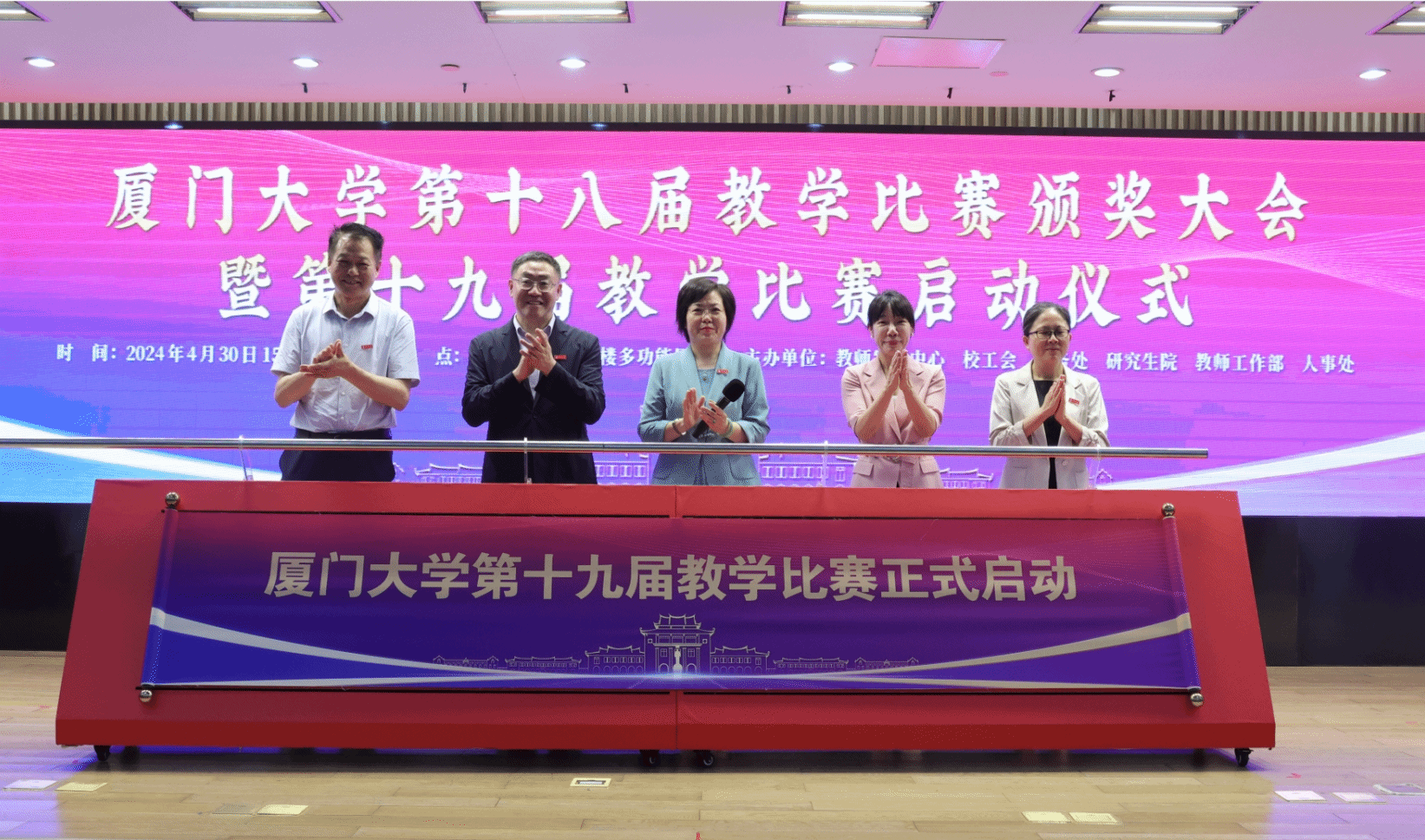 最后,在全场热烈的掌声中,邓朝晖宣布厦门大学第十九届教学比赛正式启动。邓朝晖、方颖、计国君、黄艳萍、洪秋霞共同推杆启动比赛。