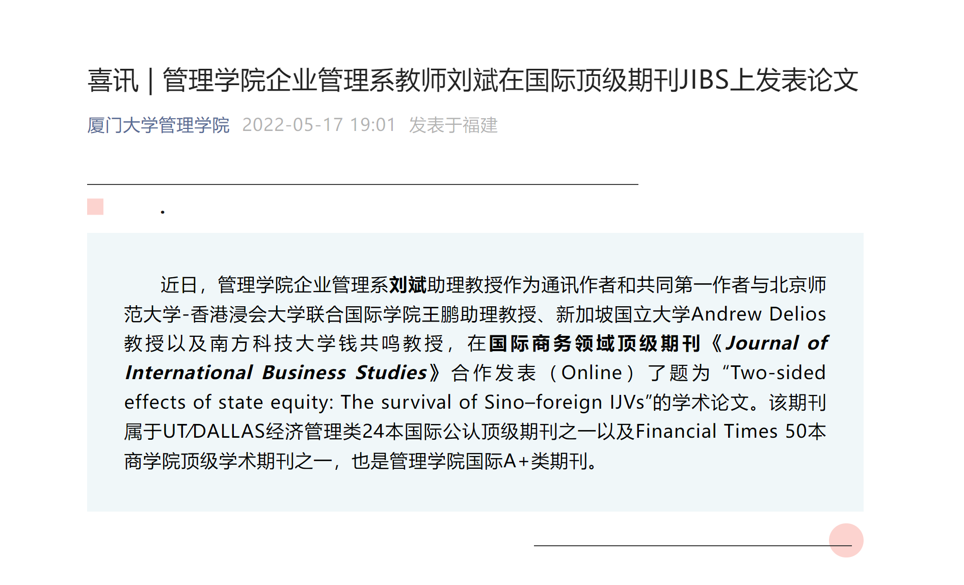 讲台上的他侃侃而谈,讲台下的他不是在文章和数据中遨游,就是在给同学们答疑解惑。刘斌老师是厦门大学企业管理系成立至今,在国际商务领域顶级期刊《Journal of International Business Studies》发表论文的第一人,也同时担任3本国内外学术期刊的编委委员、19本期刊的匿名审稿人。