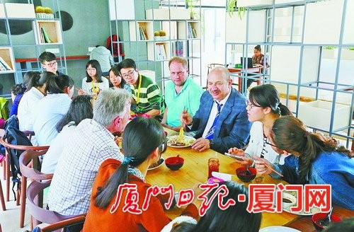 布鲁斯这次来厦大,拔尖班利用中午在学校餐厅来了个聚餐,总共17个学生,四位老师。四位老师中,布鲁斯是诺奖得主,教免疫的老师来自牛津大学,教细胞信号传导来自剑桥大学,英语写作教师毕业于哈佛大学。