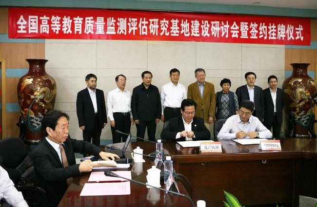 11月18日上午,由教育部教学评估中心与厦门大学联合共建的首个“全国高等教育质量监测评估研究基地”签约挂牌仪式在我校颂恩楼215会议室举行。教育部原副部长周远清、中国高等教育学会会长瞿振元、教育部高等教育教学评估中心主任吴岩、我校校长朱崇实、资深文科教授潘懋元共同为基地揭牌。教育部、福建省教育厅、清华大学、北京航空航天大学、北京教育科学研究院、中山大学有关领导以及我校相关部门负责人参加活动。我校副校长邬大光主持仪式。