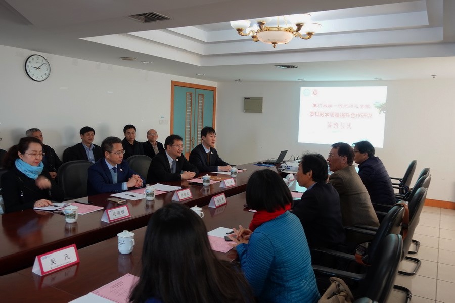 2019年1月28日上午,厦门大学教师发展中心主任邬大光教授,常务副主任朱水涌教授等专家与来访的忻州师范学院党委书记王军、副院长张爱龙一行在厦门大学颂恩楼1605会议室举行座谈,并签署《忻州师范学院本科教育教学质量提升研究》委托项目协议。