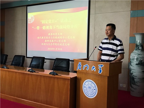 教务处党支部书记、教务处处长计国君主持本次活动。他表示,当今世界格局正经历深刻变革,世界多极化、经济全球化、社会信息化、文化多样化深入发展。2013年以来,习近平总书记提出共建丝绸之路经济带和21世纪海上丝绸之路,即“一带一路”建设,并以此为契机开展跨国互联互通。然而在“一带一路”建设过程中却伴随着各种利益冲突和国际竞争,如何看待当前世界局势,以及中国在这样的格局下将要如何应对,是接下来我们每个党员同志必须深刻思索、深入学习的内容。