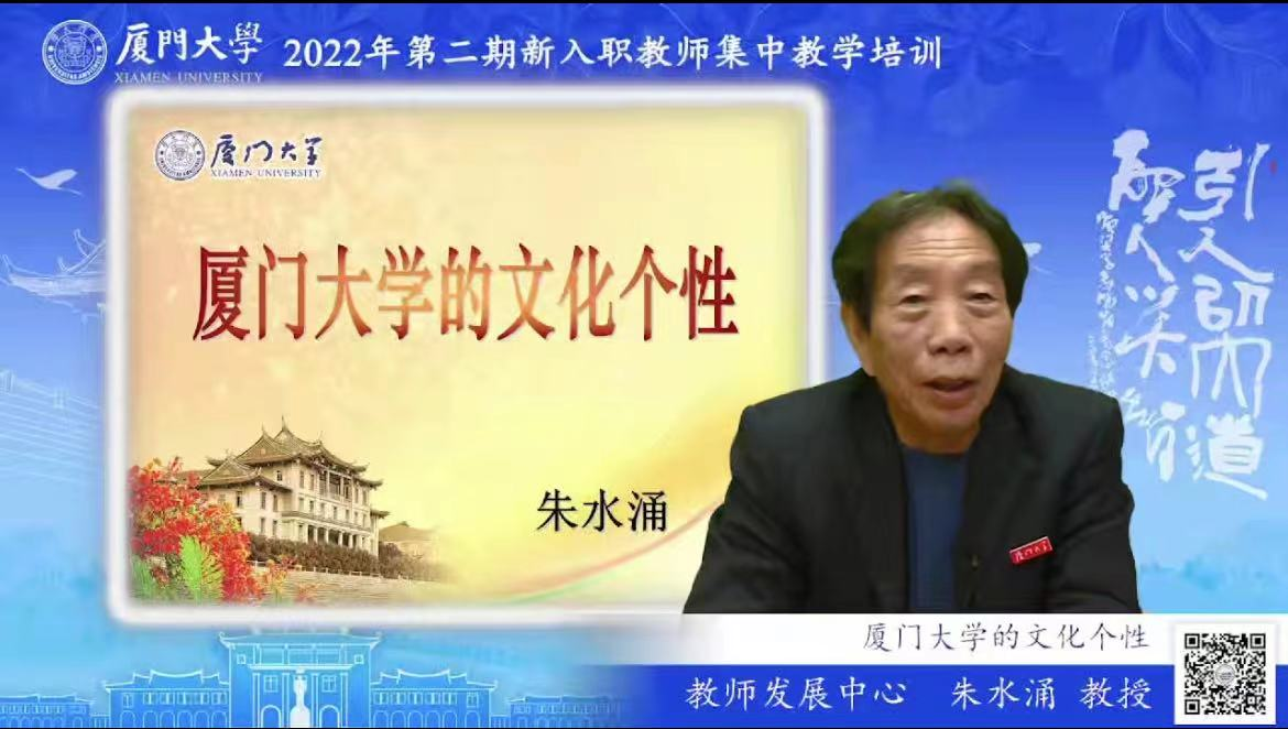 其后,教师发展中心教学指导委员会主任朱水涌教授以《厦门大学的文化个性》为主题作报告,他从“高远的胆识、自强的个性和至善的境界”三个方面着手,讲述了校主陈嘉庚先生“为民族放一异彩”的宏愿,深刻诠释了厦大人自强不息的精神品质,揭示了厦大对人才培养、学校品质的至善追求。